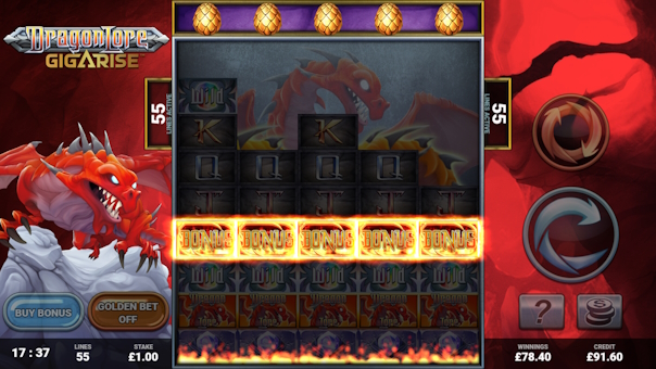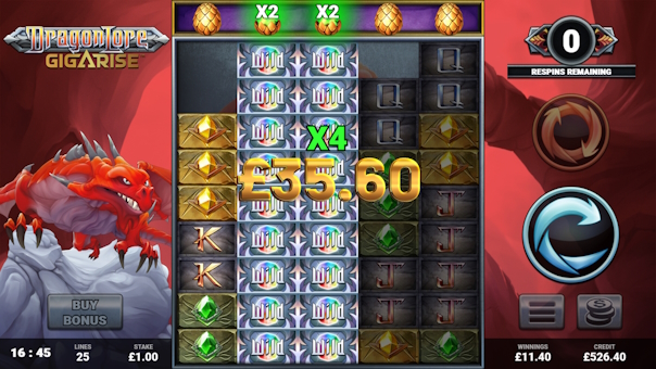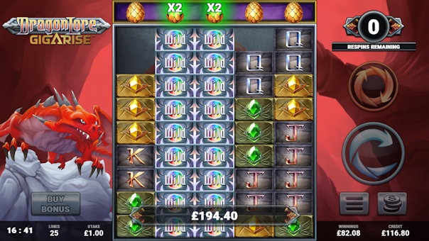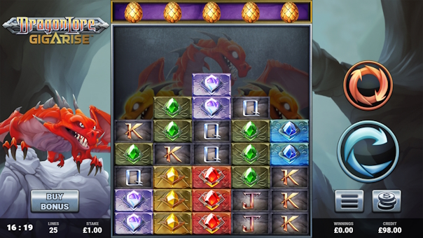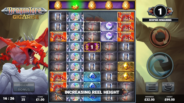 It features 5 reels that can grow up to 9 rows tall with up to 100 active paylines. The GigaRise mechanics allow for constant action and excitement. The volatility of Dragon Lore GigaRise is High and produces memorable wins in both the respins feature and the free spins feature. Mystery stacked symbols appear in the base game increasing the games action and suspense. The base game features sticky super wild reels in the respins feature. The free spins feature increases the Gigarise frequency with super wilds and multipliers per reel. There is a Golden Bet mode which increases feature frequency by 3 times. There are 5 Buy A Bonus options ranging from 75X base stake and 250X base stake.