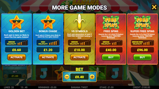 Banana Twist delivers a vibrant, high-energy slot experience on a unique 5x5 reel layout with 2 lines. Banana symbols act as wild multipliers that twist up or down the reels, boosting your win multiplier with every twist. Land 3 or more scatters to unlock free spins packed with even more twisting banana action. Hit the 4-of-a-kind feature to stick those valuable twisting bananas in place for bigger potential rewards. Enjoy a free bonus upgrade for a chance to enhance your 3-scatter bonus into the higher-paying 4-scatter feature. Plus, explore 5 exciting game modes, including bonus chasers, buying banana twists, and direct bonus purchases.