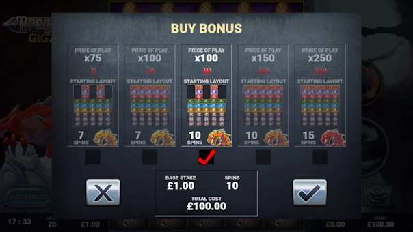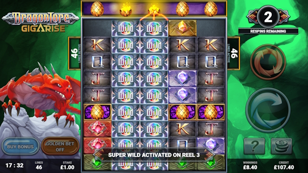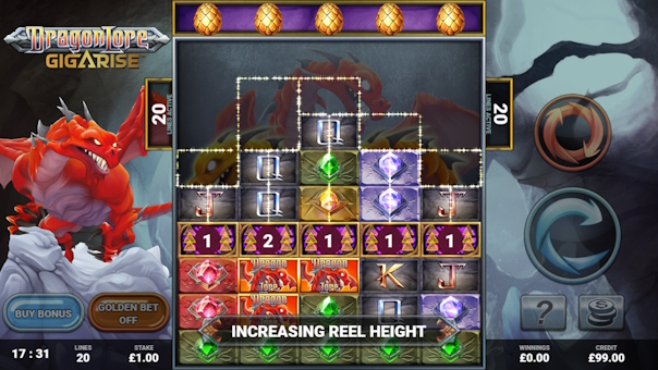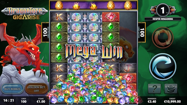 It features 5 reels that can grow up to 9 rows tall with up to 100 active paylines. The GigaRise mechanics allow for constant action and excitement. The volatility of Dragon Lore GigaRise is High and produces memorable wins in both the respins feature and the free spins feature. Mystery stacked symbols appear in the base game increasing the games action and suspense. The base game features sticky super wild reels in the respins feature. The free spins feature increases the Gigarise frequency with super wilds and multipliers per reel. There is a Golden Bet mode which increases feature frequency by 3 times. There are 5 Buy A Bonus options ranging from 75X base stake and 250X base stake.