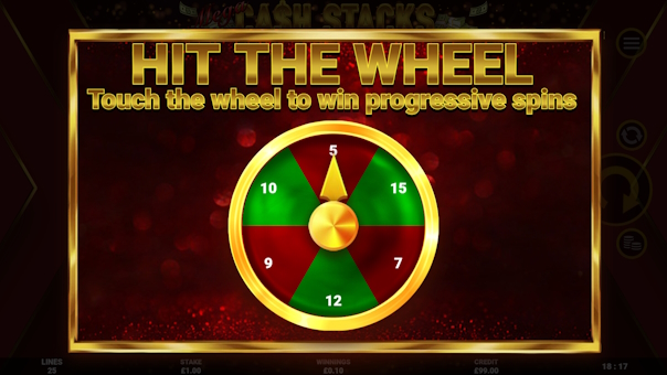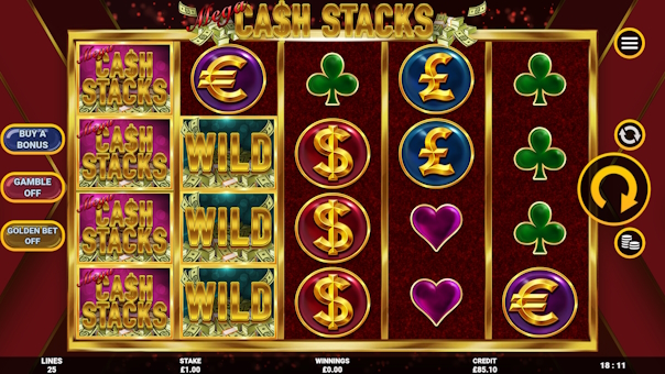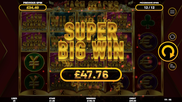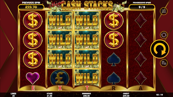 Mega Cash Stacks is a 5 x 4, 25 line game with medium to high volatility and has a Free Spins bonus featuring the Progressive Spins mechanic. The game symbols are heavily stacked and rarely give wins less than the players stake.